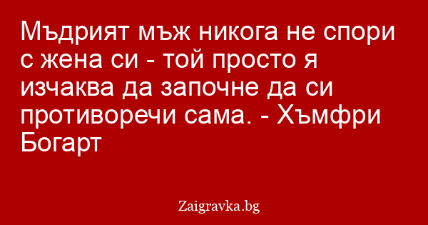 Мъдрият мъж никога не спори с жена си - той просто я изчаква да започне да си противоречи сама. - Хъмфри Богарт