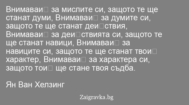 Внимавай за мислите си, защото те ще станат думи, Внимавай за думите си, защото те ще станат действия, Внимавай за действията си, защото те ще станат навици, Внимавай за навиците си, защото те ще станат твой характер, Внимавай за характера си, защото той ще стане твоя съдба.