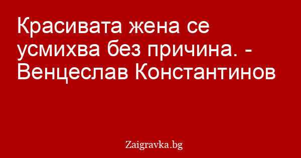 Заигравка » Цитати » Жените » Красивата жена се усмихва Цитати за жените ВраговеВремеДоброДругиДушатаЖенитеЖивотаЖивотниЗлоИзточниИстинатаКрасотаЛичностЛъжатаЛюбовМечтитеМъжетеМъкаНадеждаНастроениеПариПриятелствоРаботаСватбаСвободаСексСтрахСъветСъдбаУсмивкитеУспехУтехаХораЦелувкитеЩастие Красивата жена се усмихва без причина. - Венцеслав Константинов « Предишна Следваща » Подобни цитати Красивата жена се наслаждава на себе си. - Венцеслав Константинов Добавен преди 11 години Красивата жена, освен обожание, очаква и целувка. - Венцеслав Константинов Добавен преди 11 години Красивата жена няма нужда да се доказва. - Венцеслав Константинов Добавен преди 11 години Красивата жена няма минало, има история. - Венцеслав Константинов Добавен преди 11 години Красивата жена мълчи красиво. - Венцеслав Константинов Добавен преди 11 години