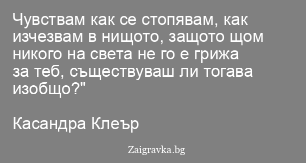 Чувствам как се стопявам, как изчезвам в нищото, защото щом никого на света не го е грижа за теб, съществуваш ли тогава изобщо?"