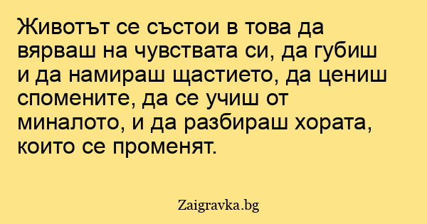 Животът се състои в това да вярваш на чувствата си, да губиш и да намираш щастието, да цениш спомените, да се учиш от миналото, и да разбираш хората, които се променят.