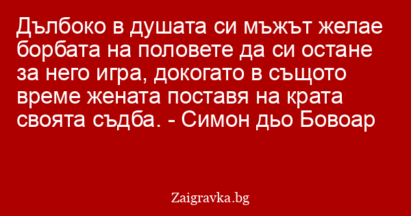Дълбоко в душата си мъжът желае борбата на половете да си остане за него игра, докогато в същото време жената поставя на крата своята съдба. - Симон дьо Бовоар