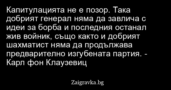 Капитулацията не е позор. Така добрият генерал няма да завлича с идеи за борба и последния останал жив войник, също както и добрият шахматист няма да продължава предварително изгубената партия. - Карл фон Клаузевиц