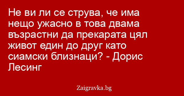 Не ви ли се струва, че има нещо ужасно в това двама възрастни да прекарата цял живот един до друг като сиамски близнаци? - Дорис Лесинг