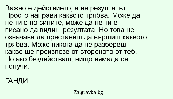 Важно е действието, а не резултатът. Просто направи каквото трябва. Може да не ти е по силите, може да не ти е писано да видиш резултата. Но това не означава да престанеш да вършиш каквото трябва. Може никога да не разбереш какво ще произлезе от стореното от теб. Но ако бездействаш, нищо нямада се получи.