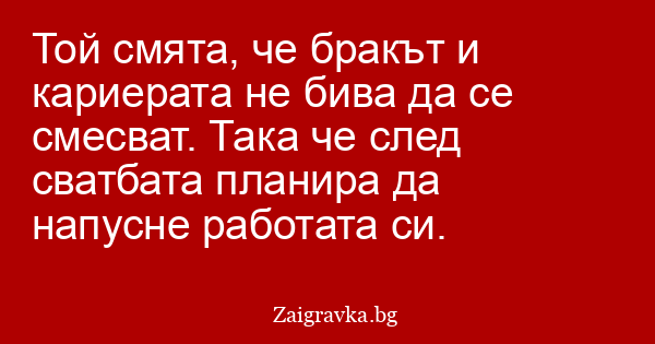Той смята, че бракът и кариерата не бива да се смесват. Така че след сватбата планира да напусне работата си.