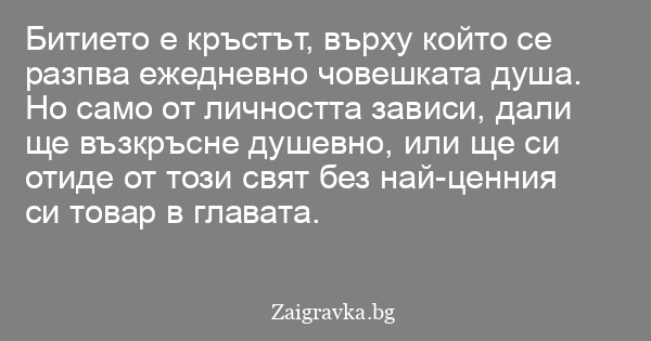 Битието е кръстът, върху който се разпва ежедневно човешката душа. Но само от личността зависи, дали ще възкръсне душевно, или ще си отиде от този свят без най-ценния си товар в главата.