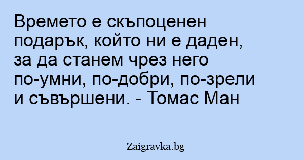 Времето е скъпоценен подарък, който ни е даден, за да станем чрез него по-умни, по-добри, по-зрели и съвършени. - Томас Ман