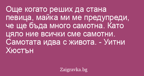 Още когато реших да стана певица, майка ми ме предупреди, че ще бъда много самотна. Като цяло ние всички сме самотни. Самотата идва с живота. - Уитни Хюстън