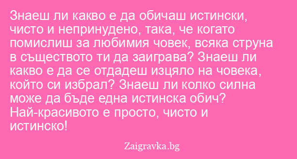 Знаеш ли какво е да обичаш истински, чисто и непринудено, така, че когато помислиш за любимия човек, всяка струна в съществото ти да заиграва? Знаеш ли какво е да се отдадеш изцяло на човека, който си избрал? Знаеш ли колко силна може да бъде една истинска обич? Най-красивото е просто, чисто и истинско!