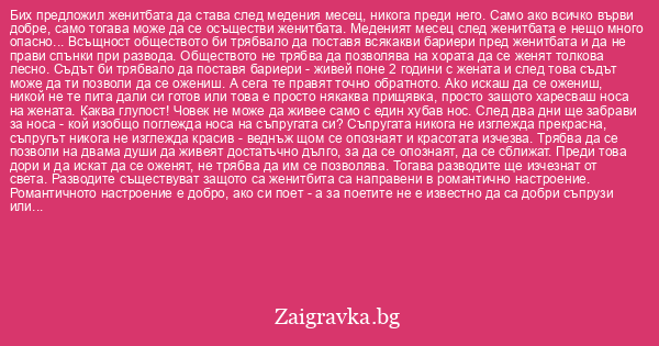 Бих предложил женитбата да става след медения месец, никога преди него. Само ако всичко върви добре, само тогава може да се осъществи женитбата.
