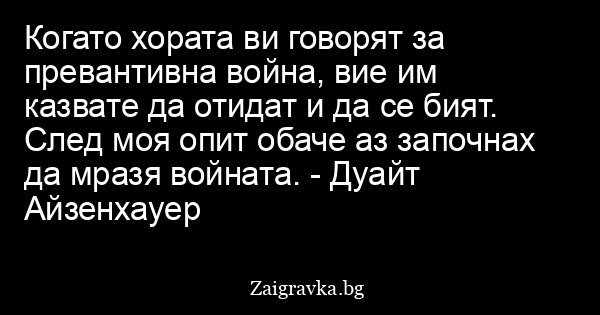 Когато хората ви говорят за превантивна война, вие им казвате да отидат и да се бият. След моя опит обаче аз започнах да мразя войната. - Дуайт Айзенхауер
