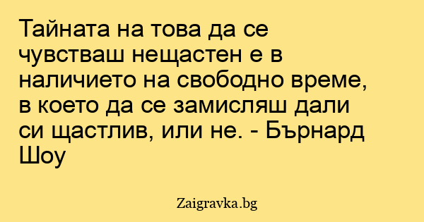 Тайната на това да се чувстваш нещастен е в наличието на свободно време, в което да се замисляш дали си щастлив, или не. - Бърнард Шоу