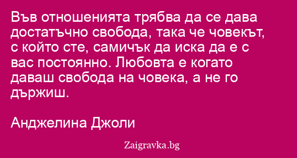 Във отношенията трябва да се дава достатъчно свобода, така че човекът, с който сте, самичък да иска да е с вас постоянно. Любовта е когато даваш свобода на човека, а не го държиш.