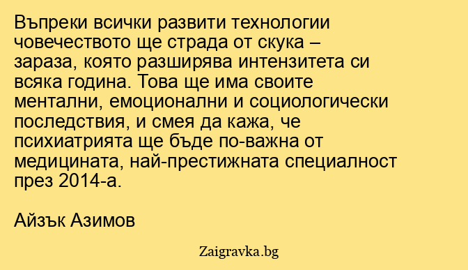 Въпреки всички развити технологии човечеството ще страда от скука – зараза, която разширява интензитета си всяка година. Това ще има своите ментални, емоционални и социологически последствия, и смея да кажа, че психиатрията ще бъде по-важна от медицината, най-престижната специалност през 2014-а.