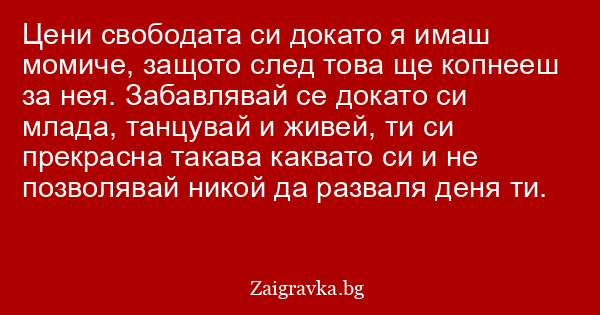 Цени свободата си докато я имаш момиче, защото след това ще копнееш за нея. Забавлявай се докато си млада, танцувай и живей, ти си прекрасна такава каквато си и не позволявай никой да разваля деня ти.