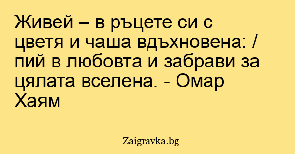 Живей – в ръцете си с цветя и чаша вдъхновена: / пий в любовта и забрави за цялата вселена. - Омар Хаям
