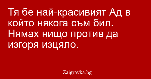 Тя бе най-красивият Ад в който някога съм бил. Нямах нищо против да изгоря изцяло.