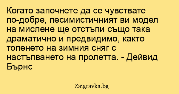 Когато започнете да се чувствате по-добре, песимистичният ви модел на мислене ще отстъпи също така драматично и предвидимо, както топенето на зимния сняг с настъпването на пролетта. - Дейвид Бърнс