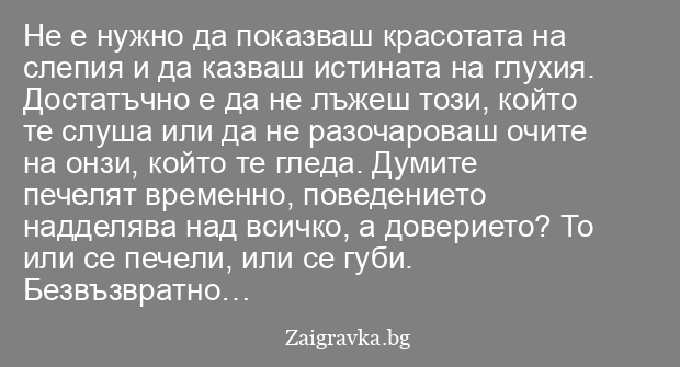 Не е нужно да показваш красотата на слепия и да казваш истината на глухия. Достатъчно е да не лъжеш този, който те слуша или да не разочароваш очите на онзи, който те гледа. Думите печелят временно, поведението надделява над всичко, а доверието? То или се печели, или се губи. Безвъзвратно…