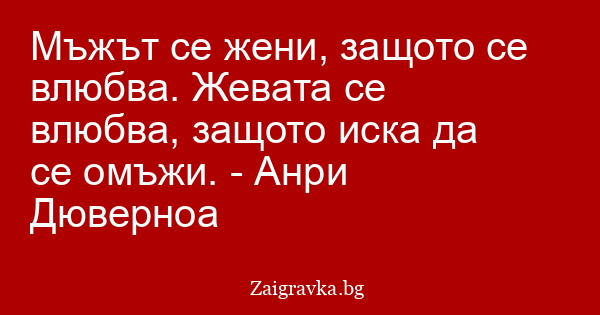 Мъжът се жени, защото се влюбва. Жевата се влюбва, защото иска да се омъжи. - Анри Дюверноа