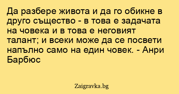 Да разбере живота и да го обикне в друго същество - в това е задачата на човека и в това е неговият талант; и всеки може да се посвети напълно само на един човек. - Анри Барбюс