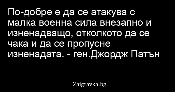 По-добре е да се атакува с малка военна сила внезапно и изненадващо, отколкото да се чака и да се пропусне изненадата. - ген.Джордж Патън