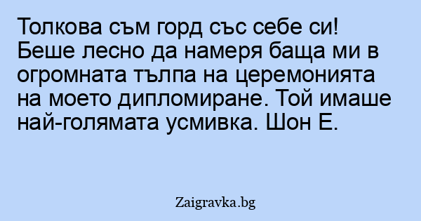 Толкова съм горд със себе си! Беше лесно да намеря баща ми в огромната тълпа на церемонията на моето дипломиране. Той имаше най-голямата усмивка. Шон Е.