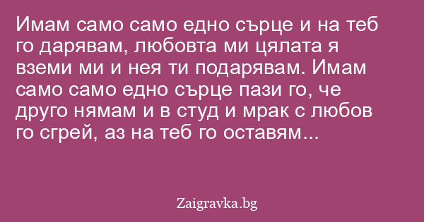 Имам само само едно сърце и на теб го дарявам, любовта ми цялата я вземи ми и нея ти подарявам. Имам само само едно сърце пази го, че друго нямам и в студ и мрак с любов го сгрей, аз на теб го оставям...