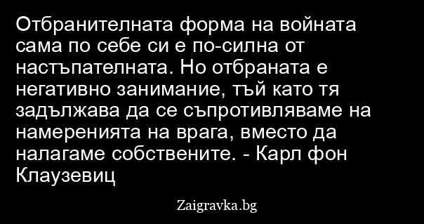 Отбранителната форма на войната сама по себе си е по-силна от настъпателната. Но отбраната е негативно занимание, тъй като тя задължава да се съпротивляваме на намеренията на врага, вместо да налагаме собствените. - Карл фон Клаузевиц