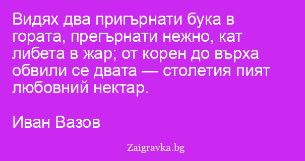 Видях два пригърнати бука в гората, прегърнати нежно, кат либета в жар; от корен до върха обвили се двата — столетия пият любовний нектар.