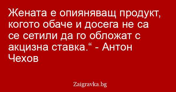 Жената е опияняващ продукт, когото обаче и досега не са се сетили да го обложат с акцизна ставка.“ - Антон Чехов