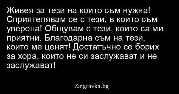 Живея за тези на които съм нужна! Сприятелявам се с тези, в които съм уверена! Общувам с тези, които са ми приятни. Благодарна съм на тези, които ме ценят! Достатъчно се борих за хора, които не си заслужават и не заслужават!