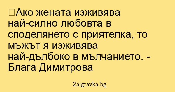Ако жената изживява най-силно любовта в споделянето с приятелка, то мъжът я изживява най-дълбоко в мълчанието. - Блага Димитрова