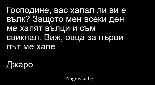 Господине, вас хапал ли ви е вълк? Защото мен всеки ден ме хапят вълци и съм свикнал. Виж, овца за първи път ме хапе.