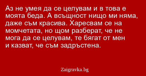 Аз не умея да се целувам и в това е моята беда. А всъщност нищо ми няма, даже съм красива. Харесвам се на момчетата, но щом разберат, че не мога да се целувам, те бягат от мен и казват, че съм задръстена.