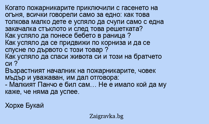 Когато пожарникарите приключили с гасенето на огъня, всички говорели само за едно: как това толкова малко дете е успяло да счупи само с една закачалка стъклото и след това решетката?