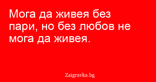 Заигравка » Цитати » Любов » Мога да живея без пари Цитати за любовта ВраговеВремеДоброДругиДушатаЖенитеЖивотаЖивотниЗлоИзточниИстинатаКрасотаЛичностЛъжатаЛюбовМечтитеМъжетеМъкаНадеждаНастроениеПариПриятелствоРаботаСватбаСвободаСексСтрахСъветСъдбаУсмивкитеУспехУтехаХораЦелувкитеЩастие Мога да живея без пари, но без любов не мога да живея. « Предишна Следваща » Подобни цитати Вместо да бъдеш против злотото, просто бъди за любовта. Добавен преди 11 години Любовта извисява силата ти на по-високо равнище. Добавен преди 11 години Можем да се научим да обичаме единствено като обичаме. Добавен преди 11 години Да обичаш е като да зърнеш рая. Добавен преди 11 години Където има голяма любов, има и големи желания. Добавен преди 11 години