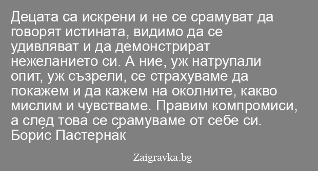 Децата са искрени и не се срамуват да говорят истината, видимо да се удивляват и да демонстрират нежеланието си. А ние, уж натрупали опит, уж съзрели, се страхуваме да покажем и да кажем на околните, какво мислим и чувстваме. Правим компромиси, а след това се срамуваме от себе си.