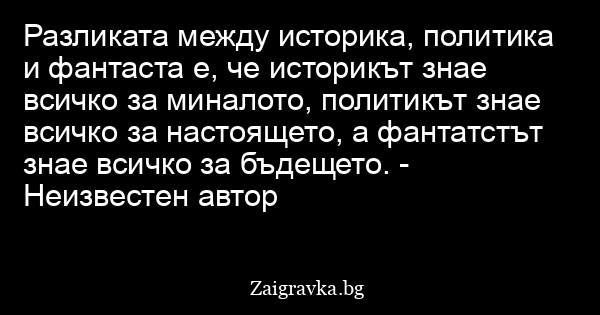 Разликата между историка, политика и фантаста е, че историкът знае всичко за миналото, политикът знае всичко за настоящето, а фантатстът знае всичко за бъдещето. - Неизвестен автор