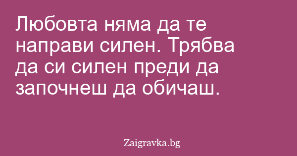Заигравка » Цитати » Любов » Любовта няма да те направи Цитати за любовта ВраговеВремеДоброДругиДушатаЖенитеЖивотаЖивотниЗлоИзточниИстинатаКрасотаЛичностЛъжатаЛюбовМечтитеМъжетеМъкаНадеждаНастроениеПариПриятелствоРаботаСватбаСвободаСексСтрахСъветСъдбаУсмивкитеУспехУтехаХораЦелувкитеЩастие Любовта няма да те направи силен. Трябва да си силен преди да започнеш да обичаш. « Предишна Следваща » Подобни цитати Достигни до истината отвъд разума. Любовта е мостът. Добавен преди 11 години Всеки ден те обичам повече от вчера и по-малко от утре. Добавен преди 11 години Живот без любов е като дърво без цветове или плодове. Добавен преди 11 години Мога да живея без пари, но без любов не мога да живея. Добавен преди 11 години Вместо да бъдеш против злотото, просто бъди за любовта. Добавен преди 11 години