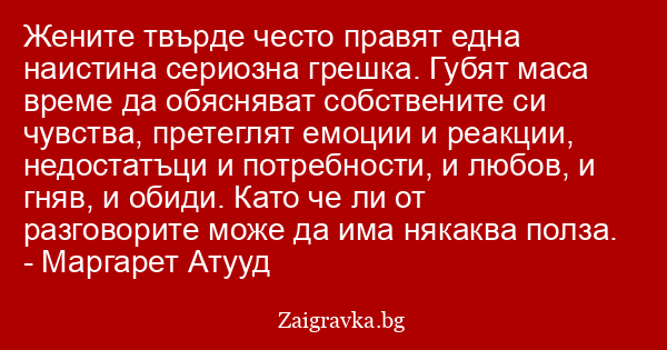 Жените твърде често правят една наистина сериозна грешка. Губят маса време да обясняват собствените си чувства, претеглят емоции и реакции, недостатъци и потребности, и любов, и гняв, и обиди. Като че ли от разговорите може да има някаква полза. - Маргарет Атууд