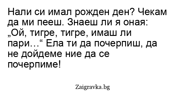 Нали си имал рожден ден? Чекам да ми пееш. Знаеш ли я оная: „Ой, тигре, тигре, имаш ли пари…“ Ела ти да почерпиш, да не дойдеме ние да се почерпиме!