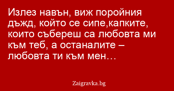 Излез навън, виж поройния дъжд, който се сипе,капките, които събереш са любовта ми към теб, а останалите – любовта ти към мен…