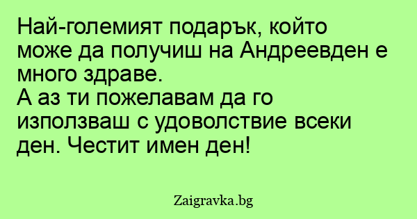 Ако не си сбъднал мечта на Андреевден, то е защото не си имал време от многото приятели, които са те уважили за празника. Но на сутринта ще разбереш, че си сбъднал вече мечта – да има хора, които истински да те обичат. Честит имен ден и бъди обичан и почитан!