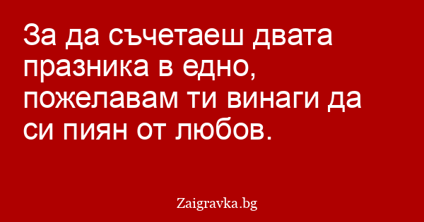 За да съчетаеш двата празника в едно, пожелавам ти винаги да си пиян от любов.