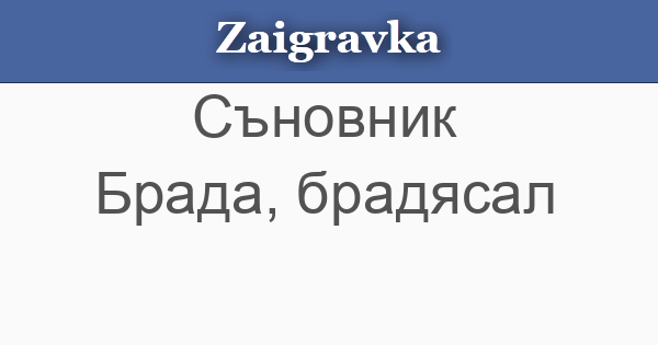 • БРАДА, БРАДЯСАЛ - ако сънуваш, че имаш дълга и гъста брада, чака те печалба. Ако е обръсната или късо подстригана, ще имаш загуби или ще станеш обект на подигравки. Ако е посивяла, ще те споходи лош късмет. Ако е черна и хубава, ще се радваш на успехи, здраве и почести. Ако е червена, ще участваш в спор. Ако е прекалено остра и бодлива, значи говориш твърде много и ще си патиш от това. Ако е рядка или пада, значи ще страдаш от хорското присмехулство. Ако някой те дърпа за брадата, ще се разминеш на косъм от сериозна имуществена загуба. Ако видиш в съня си човек с брада, значи някой ще се опита да ти наложи волята си и трябва да му се противопоставиш. Ако жена сънува себе си с брада, значи ще се окаже, че бракът й е несполучлив.