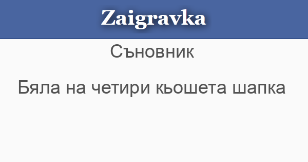 Заигравка » Съновник » Бяла на четири кьошета абвгдежзийклмнопрстуфхцчшщъьюя Бяла на четири кьошета шапка • БЯЛА НА ЧЕТИРИ КЬОШЕТА ШАПКА - , ако сънуваш че имаш на главата си, значи чест и достоинство. « Предишна Следваща »