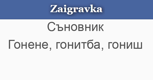 • ГОНЕНЕ, ГОНИТБА, ГОНИШ - ли някого насън, значи излишно се конфронтираш с хора, които могат да ти помогнат. Ако тебе те гонят насън, сам си създаваш врагове. Игра на гонене в съня е знак за любовни закачки между приятели. Бясна гонитба ако сънуваш, е сигнал за чревни или стомашни проблеми.
