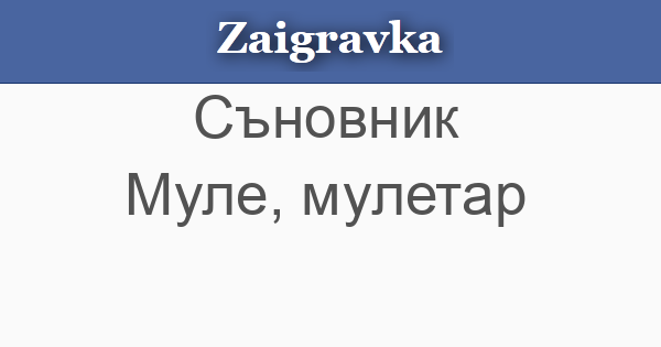• МУЛЕ, МУЛЕТАР - в съня означават, че упоритостта и трудолюбието ти ще бъдат богато възнаградени. Ако яздиш муле, ще се ожениш за богат партньор. Ако те ритне муле, няма да успееш да се задомиш. Ако сънуваш бяло муле, ще се влюбиш в чужденец. Стадо мулета без мулетар са знак за многобройни ухажори и нито един сериозен кандидат за брак.